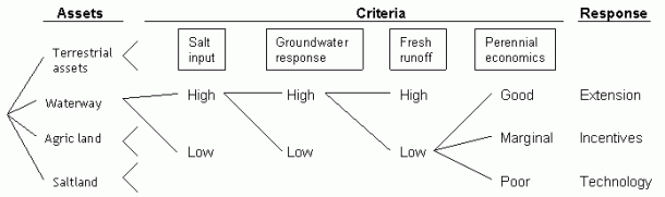 The process of identifying the appropriate response to salinity is illustrated in the figure below. It shows how the choice depends on the type of asset and on several other factors. The set of influential factors is different for each asset type. For waterways, the important factors are salt input, groundwater response, fresh runoff and the economics of perennials.
