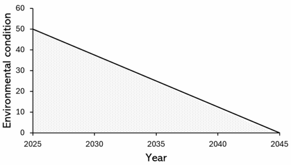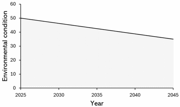 Sadly, we know that many environments are undergoing a slow process of degradation, potentially due to things like weeds, pests, disease, physical damage, or climate change. In those cases, the baseline for measuring damage would be declining. This is illustrated in Figure 1.